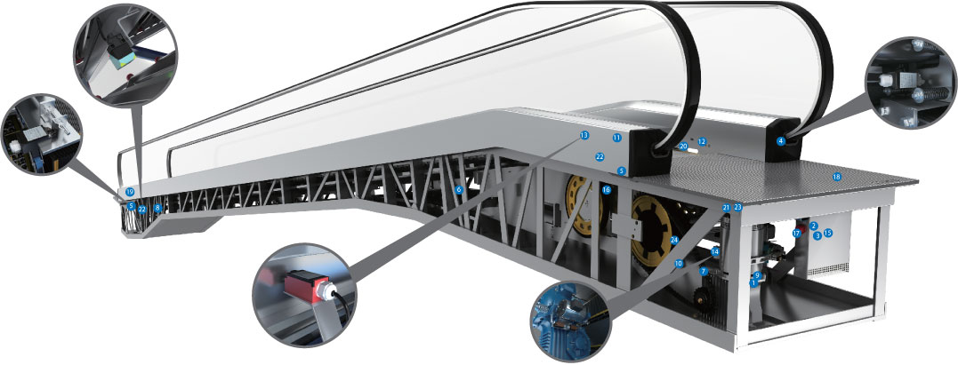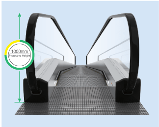 If any foreign object is stuck between the rubber head and handrail the safety switch behind the rubber entrance will start automatically to stop the moving walk from moving.